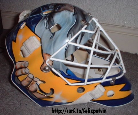 “My first painted mask was done by Mom’s friend who happened to be an airbrush artist. It was a direct rip off of Olaf Kolzig’s Godzilla mask. I remember when I got it for Christmas in 1998, I just stared at it I was so shocked! My all time favorite mask has to be Olaf Kolzig’s Godzilla. It has sentimental value because he was my favourite goalie growing up and my first mask was a copy of his”.