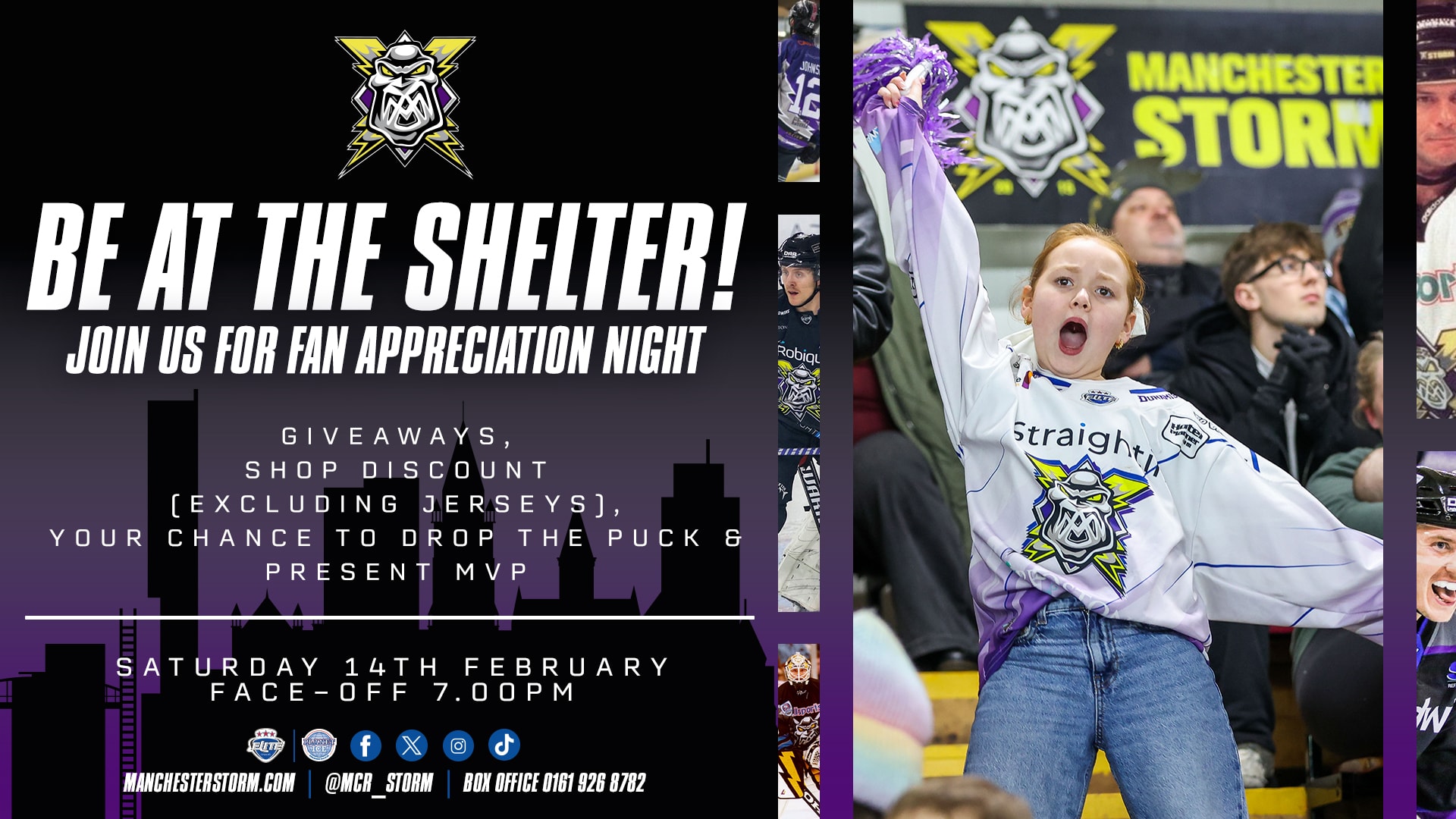 If you can’t make it, not to worry.  You can cheer on the Storm wherever you are with our game night webcast, available to purchase on Manchester Storm TV as we take you through the action.